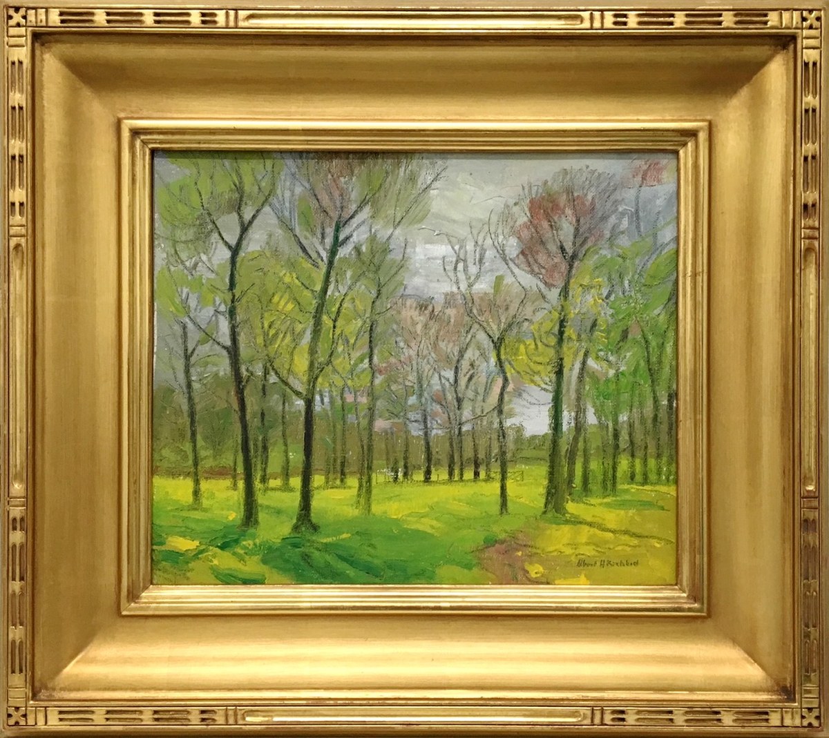 While teaching at the Art Institute of Chicago during the fall, winter and early spring months, Albert Krehbiel often enjoyed painting the environs of his studio in rural Park Ridge, Illinois. His views of the Des Plaines River and surrounding countryside represent some of his finest achievements. Frequently these works are quiet winter landscapes. These landscapes, contemplative works achieving a high degree of light within a limited range of color, espouse a careful, mediative technique emphasizing the transitory effects of winter daylight. According to the artist’s family, from 1912 through 1930, Albert Krehbiel was often known to leave his Park Ridge home on a freezing cold morning, not returning until the end of the day with a group of freshly painted landscapes.