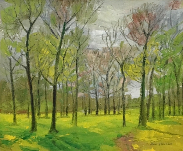 Albert Krehbiel was a devoted painting instructor, maintaining a full class schedule at the Art Institute of Chicago throughout much of the second decade of the twentieth century. In 1913, he additionally joined the faculty at the Armour Institute of Technology (later the Illinois Institute of Technology) as an instructor of architectural drawing. He continued to paint and exhibit his work at annual juried exhibitions, particularly those at the Art Institute of Chicago. Indeed, Krehbiel’s legacy is best manifested by his extensive exhibition record at the Art Institute, where he showed over thirty times from 1906 through 1939, including a one man show in 1922. Krehbiel’s painting by the middle teens maintained a fluid, naturalistic approach, capturing the immediacy of light, atmosphere and color of a specific moment in time. on.