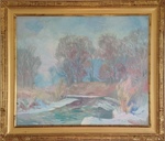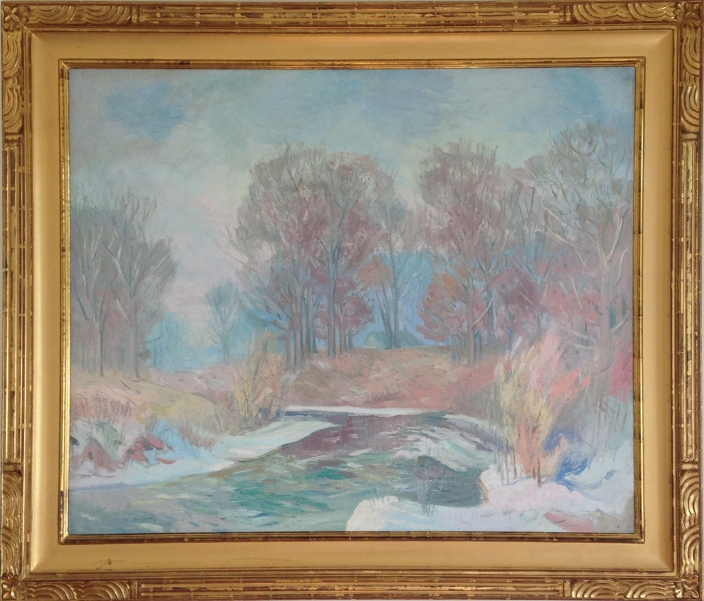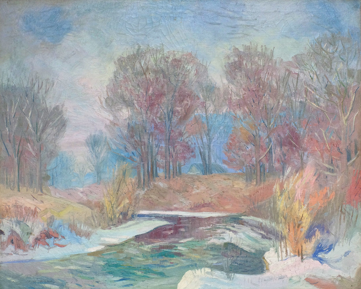 While teaching at the Art Institute of Chicago during the fall, winter and early spring months, Albert Krehbiel often enjoyed painting the environs of his studio in rural Park Ridge, Illinois. His views of the Des Plaines River and surrounding countryside represent some of his finest achievements. Frequently these works are quiet winter landscapes. These landscapes, contemplative works achieving a high degree of light within a limited range of color, espouse a careful, mediative technique emphasizing the transitory effects of winter daylight. According to the artist’s family, from 1912 through 1930, Albert Krehbiel was often known to leave his Park Ridge home on a freezing cold morning, not returning until the end of the day with a group of freshly painted landscapes.