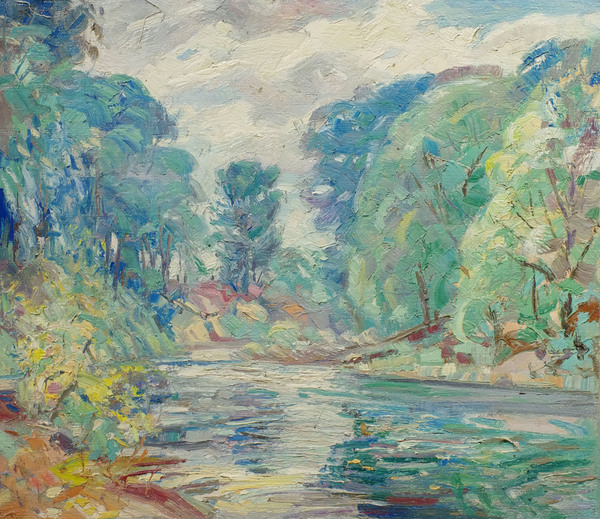 While teaching at the Art Institute of Chicago during the fall, winter and early spring months, Albert Krehbiel often enjoyed painting the environs of his studio in rural Park Ridge, Illinois. His views of the Des Plaines River and surrounding countryside represent some of his finest achievements. Frequently these works are quiet winter landscapes. These landscapes, contemplative works achieving a high degree of light within a limited range of color, espouse a careful, mediative technique emphasizing the transitory effects of winter daylight. According to the artist’s family, from 1912 through 1930, Albert Krehbiel was often known to leave his Park Ridge home on a freezing cold morning, not returning until the end of the day with a group of freshly painted landscapes.