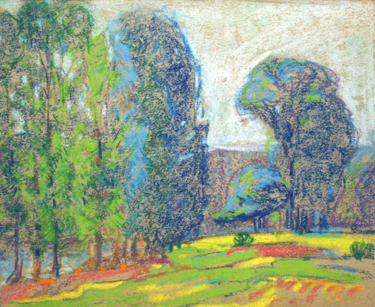 In the 1920s, Albert Krehbiel became a leading figure of the Chicago Art Institute Summer School of Painting (later named Ox-Bow) in Saugatuck, Michigan. The school, founded in 1910 by a group of Chicago artists led by Frederick Fursman, became a popular destination for artists and students throughout the Midwest. Krehbiel became an influential instructor at the school from 1926 through 1932. In 1934, he founded his own art school in Saugatuck, named The AK Studio. Much of Krehbiel’s artwork completed in Michigan throughout the 1920s and 30s is best expressed in his numerous pastels. Absorbed with his classes and teachings during the summer sessions, he often had little time to complete large canvasses. He enjoyed the freshness and portability of working with pastels. These works, frequently completed in early morning or late afternoon, often depict serene sunlit views of the Kalamazoo River and the rolling landscape surrounding Saugatuck.