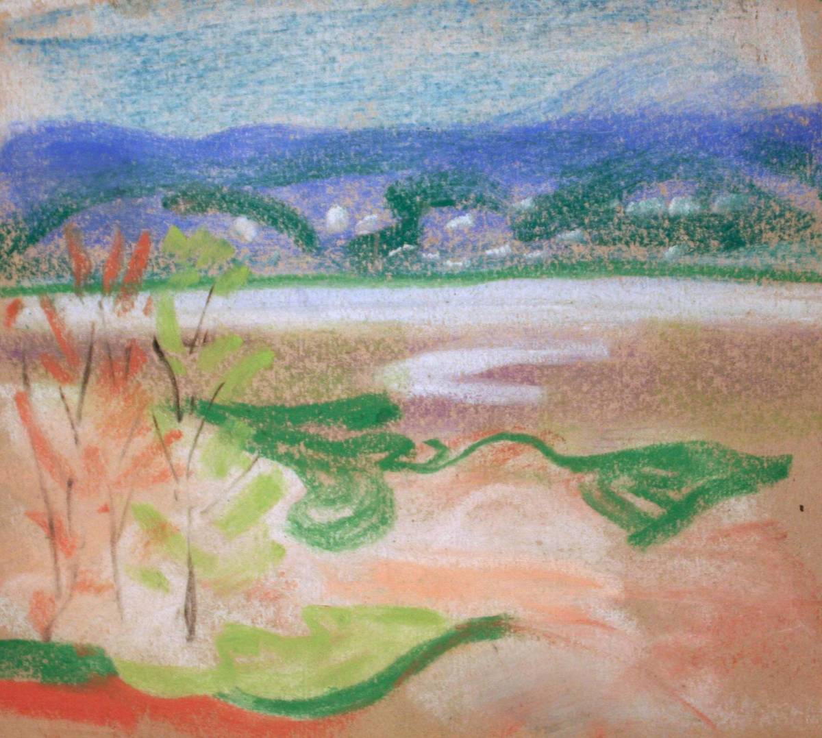 In the 1920s, Albert Krehbiel became a leading figure of the Chicago Art Institute Summer School of Painting (later named Ox-Bow) in Saugatuck, Michigan. The school, founded in 1910 by a group of Chicago artists led by Frederick Fursman, became a popular destination for artists and students throughout the Midwest. Krehbiel became an influential instructor at the school from 1926 through 1932. In 1934, he founded his own art school in Saugatuck, named The AK Studio. Much of Krehbiel’s artwork completed in Michigan throughout the 1920s and 30s is best expressed in his numerous pastels. Absorbed with his classes and teachings during the summer sessions, he often had little time to complete large canvasses. He enjoyed the freshness and portability of working with pastels. These works, frequently completed in early morning or late afternoon, often depict serene sunlit views of the Kalamazoo River and the rolling landscape surrounding Saugatuck.