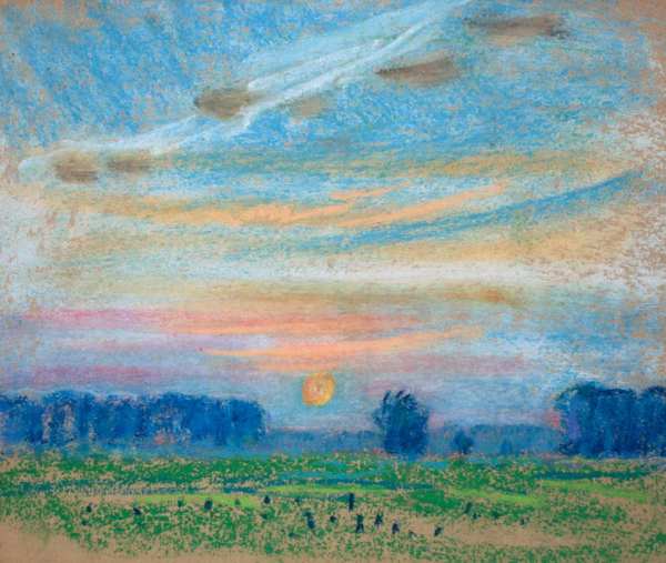 In the 1920s, Albert Krehbiel became a leading figure of the Chicago Art Institute Summer School of Painting (later named Ox-Bow) in Saugatuck, Michigan. The school, founded in 1910 by a group of Chicago artists led by Frederick Fursman, became a popular destination for artists and students throughout the Midwest. Krehbiel became an influential instructor at the school from 1926 through 1932. In 1934, he founded his own art school in Saugatuck, named The AK Studio. Much of Krehbiel’s artwork completed in Michigan throughout the 1920s and 30s is best expressed in his numerous pastels. Absorbed with his classes and teachings during the summer sessions, he often had little time to complete large canvasses. He enjoyed the freshness and portability of working with pastels. These works, frequently completed in early morning or late afternoon, often depict serene sunlit views of the Kalamazoo River and the rolling landscape surrounding Saugatuck.