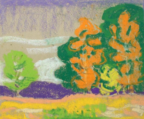 In the 1920s, Albert Krehbiel became a leading figure of the Chicago Art Institute Summer School of Painting (later named Ox-Bow) in Saugatuck, Michigan. The school, founded in 1910 by a group of Chicago artists led by Frederick Fursman, became a popular destination for artists and students throughout the Midwest. Krehbiel became an influential instructor at the school from 1926 through 1932. In 1934, he founded his own art school in Saugatuck, named The AK Studio. Much of Krehbiel’s artwork completed in Michigan throughout the 1920s and 30s is best expressed in his numerous pastels. Absorbed with his classes and teachings during the summer sessions, he often had little time to complete large canvasses. He enjoyed the freshness and portability of working with pastels. These works, frequently completed in early morning or late afternoon, often depict serene sunlit views of the Kalamazoo River and the rolling landscape surrounding Saugatuck.