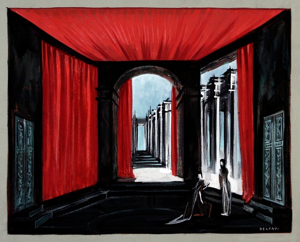 Born in Paris, France in 1914, Andre Delfau was a French artist, and internationally acclaimed stage set and costume designer who worked world-wide from the 1930s to the 1980s. Early in his career, Delfau created fashion designs for such major Paris couture houses as Balmain, Jean Patou and Balenciaga. He completed set designs and costumes for the Royal Danish Ballet, the Royal Ballet of Great Britain, the Paris Opera, the Dance Theater of Harlem, the Ruth Page International Ballet, the Civic Ballet of Chicago, the Chicago Opera Ballet and the Lyric Opera of Chicago, among others. Most notably, Delfau designed the elaborate stage sets and costumes for the 1986 PBS television production of the Viennese operetta, "Die Fledermaus".