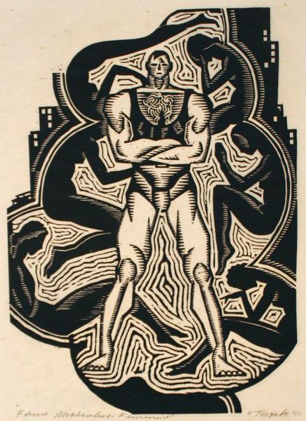 Commissioned in 1927 to illustrate a privately printed book, Charles Turzak created ten amusing woodcuts. The book was titled EASTWARD WHOA! and authored by Ben C. Pittsford, who owned an advertising agency in Chicago, Illinois. The book contains a humorous diary travel log interspersed with boyhood reminisces, and comical events during the four Pittsford brother's (who referred to themselves as "The Four Horsemen") auto trip to New York Citya two week holiday in the spring of 1927.