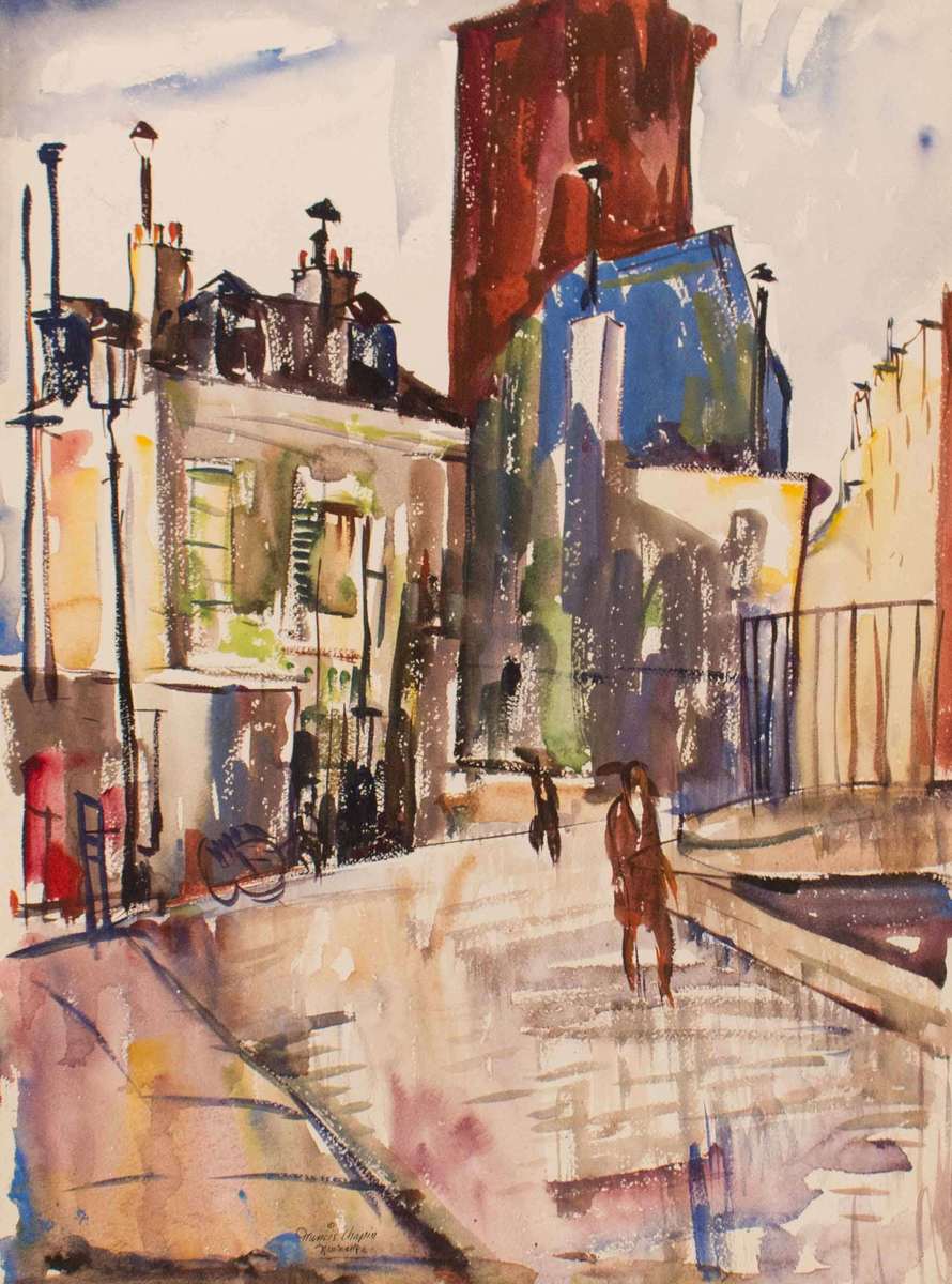 A prolific painter, Chapin produced numerous works while traveling in Mexico, France, Spain, Saugatuck and Martha’s Vineyard, where he frequently spent summers and taught at the Old Sculpin Gallery there. Chapin was best recognized for his dynamic and vibrant images of Chicago during the 1930s and '40s. Chapin was a resident of the city's Old Town neighborhood where he lived and kept his studio on Menomonee Street for many years. Described as a “colorful figure, nearly 6 feet 6 inches tall, and thin, and usually wearing tweeds”, it is easy to imagine Chapin at work observing the busy street life of the city.
