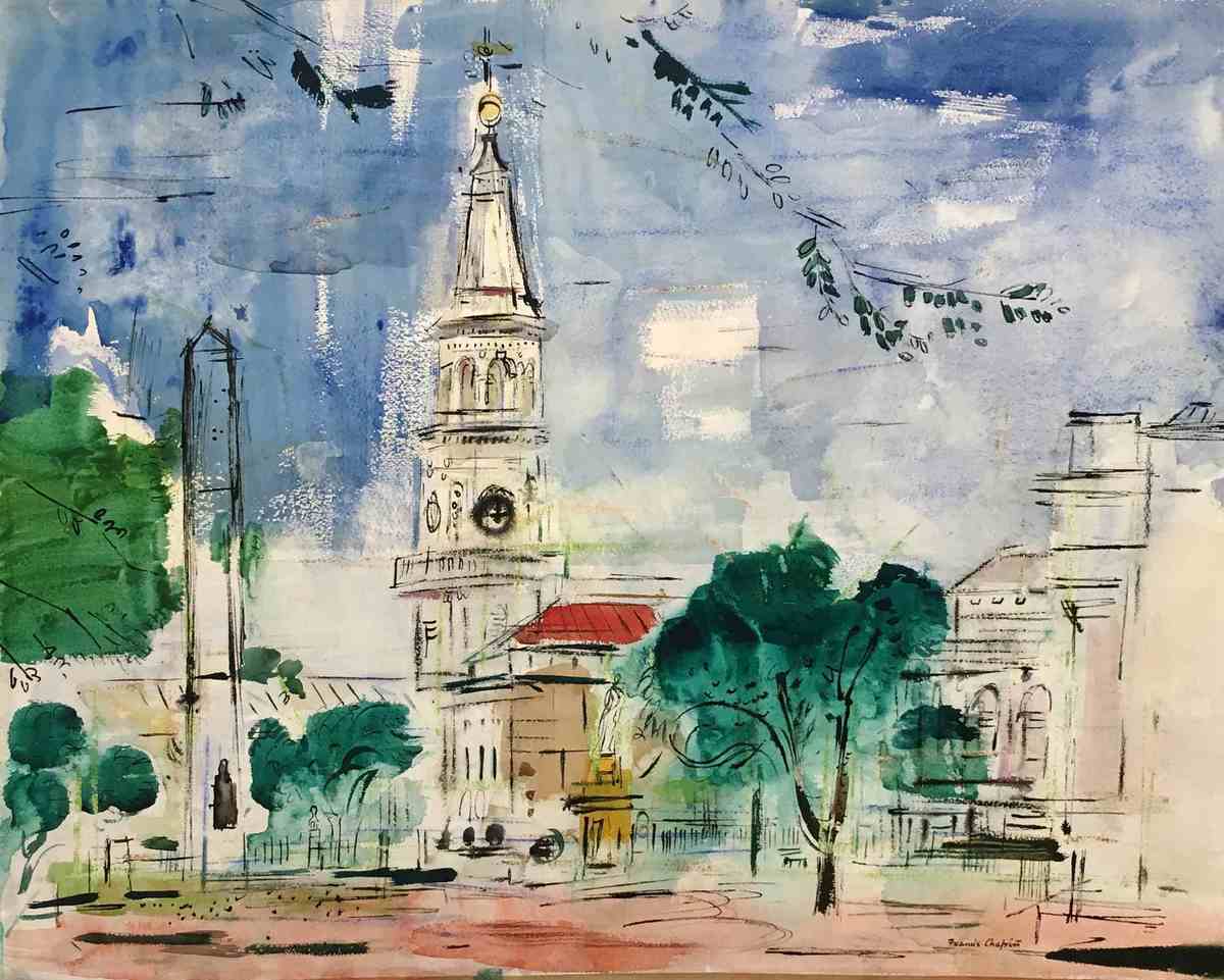 A prolific painter, Chapin produced numerous works while traveling in Mexico, France, Spain, Saugatuck and Martha’s Vineyard, where he frequently spent summers and taught at the Old Sculpin Gallery there. Chapin was best recognized for his dynamic and vibrant images of Chicago during the 1930s and '40s. Chapin was a resident of the city's Old Town neighborhood where he lived and kept his studio on Menomonee Street for many years. Described as a “colorful figure, nearly 6 feet 6 inches tall, and thin, and usually wearing tweeds”, it is easy to imagine Chapin at work observing the busy street life of the city.