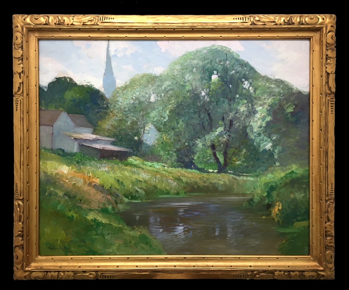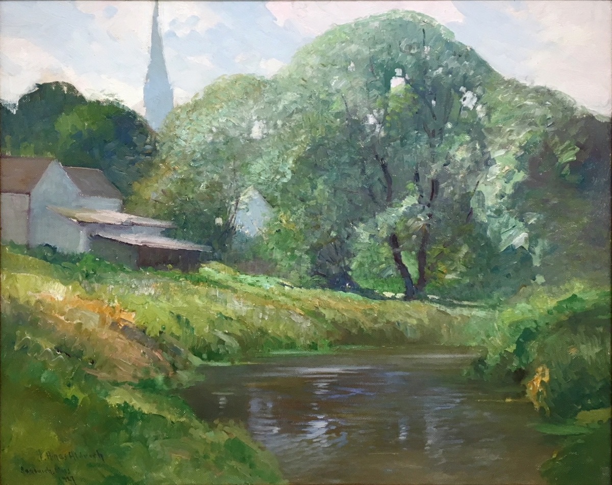 Born in Worcester, Massachusetts in 1872, George Ames Aldrich began his early training as an artist at the Art Student's League in New York. He continued his studies in Paris at the prestigious Académie Julian and Académie Colarossi, where he studied under the great masters James McNeill Whistler and Fritz Thaulow. In the 1890s, he worked as an illustrator for Punch Magazine and the London Times. In 1909 and 1910, Aldrich maintained a studio in Dieppe, where by Taulow's influence he was attracted to the quiet harbors and waterways of Brittany and Normandy. He returned to the United States at the time of he First World War where he applied his accomplished painting skills to interpret his native country. His favorite locals included the fishing village of Gloucester, Massachusetts and the rolling hillsides of rural Brown County, Indiana. Aldrich excelled at painting pastoral river landscapes and the reflection of light upon water. Occasionally he departed from these bucolic subjects to paint the steel mills of the Chicago area. These paintings, often large brooding industrial nocturnes, are executed in the gritty manner of the New York Ashcan School and are powerful commentaries of the American Industrial Revolution.