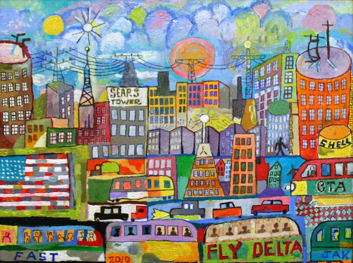 John A. Knudsen was born in 1937 in Brooklyn, MI raised in Chicago, IL. The son of a Lutheran minister, Knudsen’s family frequently moved to different locales, providing Knudsen with life experiences in both urban and rural settings. These varied venues provided inspiration for his drawing and painting.