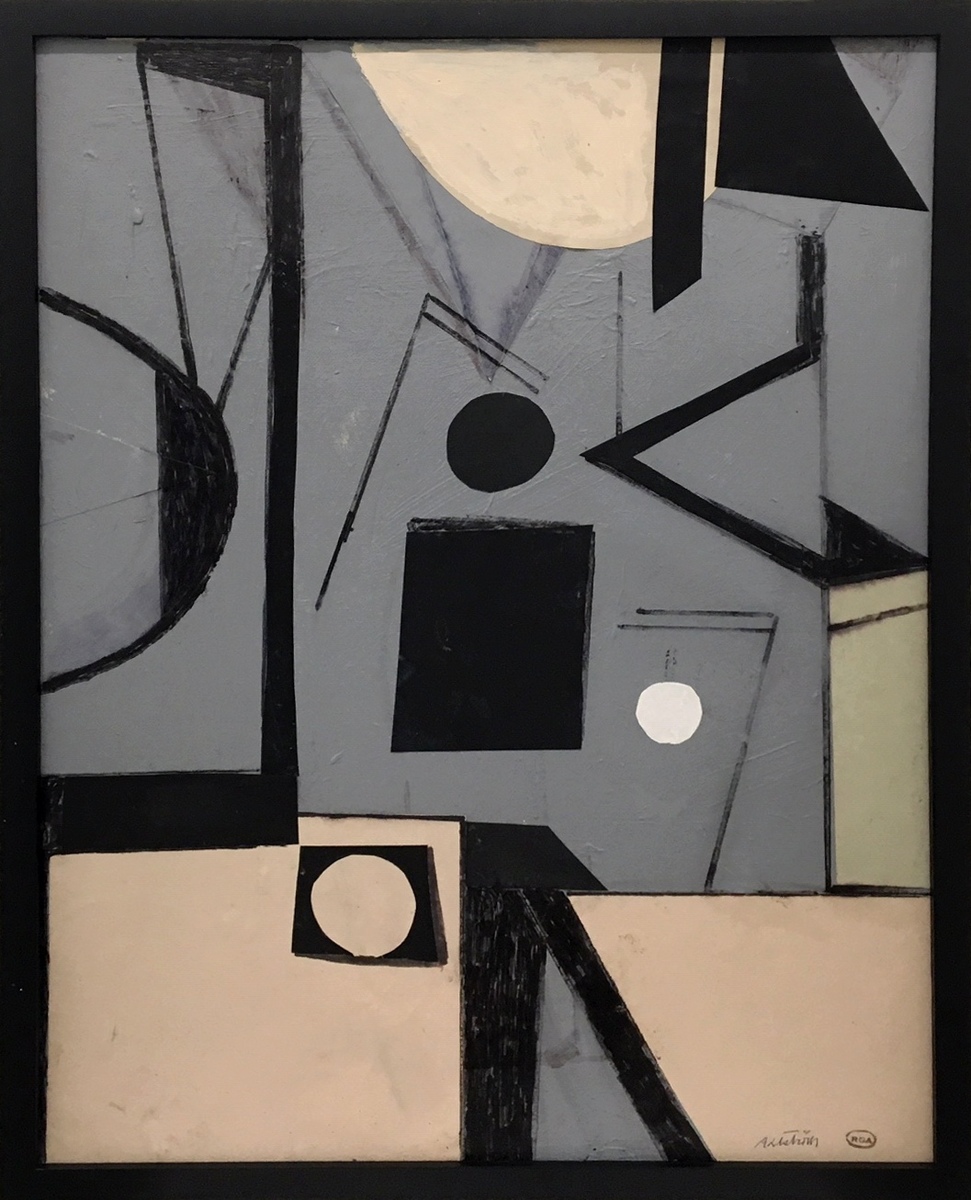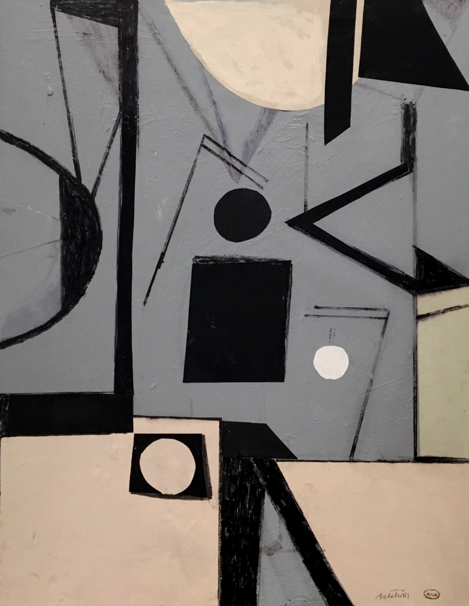 Ronald Ahlström was born in Chicago, IL in 1922. During World War II, he fought in the Pacific Theater serving as a Sergeant in the U.S. Army. After the war, he returned to Chicago to study painting at the School of the Art Institute. In the early 1960s, Ahlström worked as the curator at the Tacoma Art Museum in Tacoma, WA. A talented painter and artist, Alhström also was a noted bass fiddler and guitarist. He often played professionally in night clubs during the late 1940s and ‘50s. Ahlström exhibited his artwork nationally, including shows at the Art Institute of Chicago and the Corcoran Gallery of Art in Washington, D.C., among others. In 1958, he was awarded the William H. Bartels Prize of five hundred dollars at the Art Institute of Chicago. Ahlström became best recognized for his intricate and subtly rendered abstract compositions that often integrated painting, drawing and collage. He died at the age of 90 in Chicago in 2012.