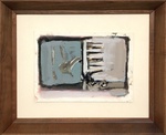His artwork, typically abstract in nature, is executed with a limited range of color but with a great depth of scope. His tranquil compositions appear reminiscent of the broad aerial views the artist would have observed aloft from his flights in a B- 17 bomber. Upon a discerning look, viewers may recognize elements of reality, such as the patchwork of fields and rooftops seen from above. Outlines of aircraft fuselage may be interspersed with abstracted figural sketches and fragmented numerical equations. In one of his journals Dalziel wrote ”To represent these forces with shapes that have feeling. Not a decorative arrangement of meaningless shapes, but shapes that are vital and so alive that they project themselves with meaning.”
